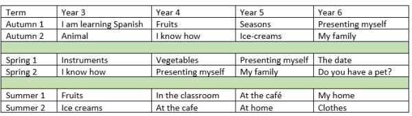 | Autumn 1 | I am learning Spanish | Fruits | Seasons | Presenting myself |