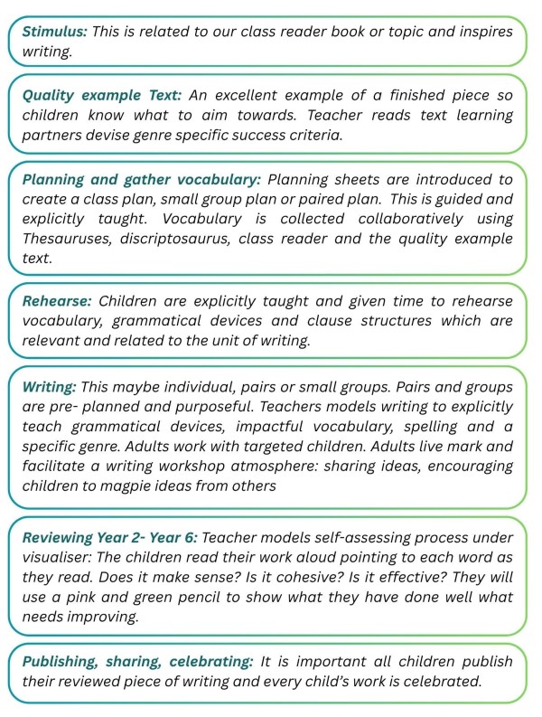 Through high quality instructional teaching, children learn the skills needed to become a confident, community of writers.