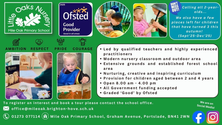 You can now purchase a ‘Little Oaks Nursery’ T-shirt, priced at £5.75, from Klassy Kids; just select Mile Oak primary School for options. Please ask the nursery team to see the available sizes. Here, you can also purchase a Mile Oak Primary School jumper, this can be especially useful if your child is transitioning to our reception classes in September.