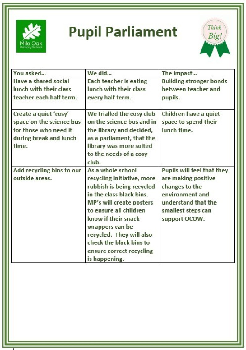 Mile Oak Pupil Parliament are proud to have democratically elected MP’s who ensure that each and every child’s voice in the school is heard.